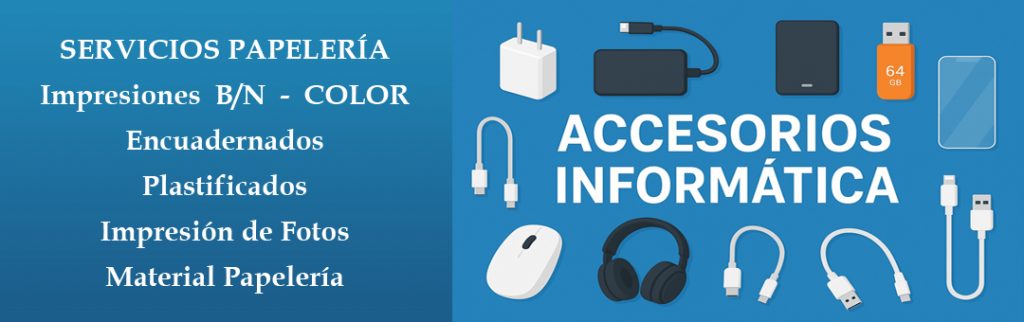 Teclados, baterias, Cargadores, Cables, Adaptadores, Altavoces, Memorias, Micrófonos, Fuentes de alimentación, Pilas, Disco duro, etc…